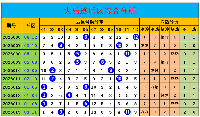上期后区开出号码03、11,为冷冷组合。最近10期后区冷热比9:11,热码整体走势稍热,最近10期后区冷冷组合开出2期,冷热组合开出2期,热冷组合开出3期,热热组合开出3期。