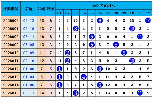 上期回顾:大乐透第2026015期奖号:前区01、04、10、13、17,后区03、11,前区奖号和值为45,012路比为0:4:1,后区开出小大组合03、11